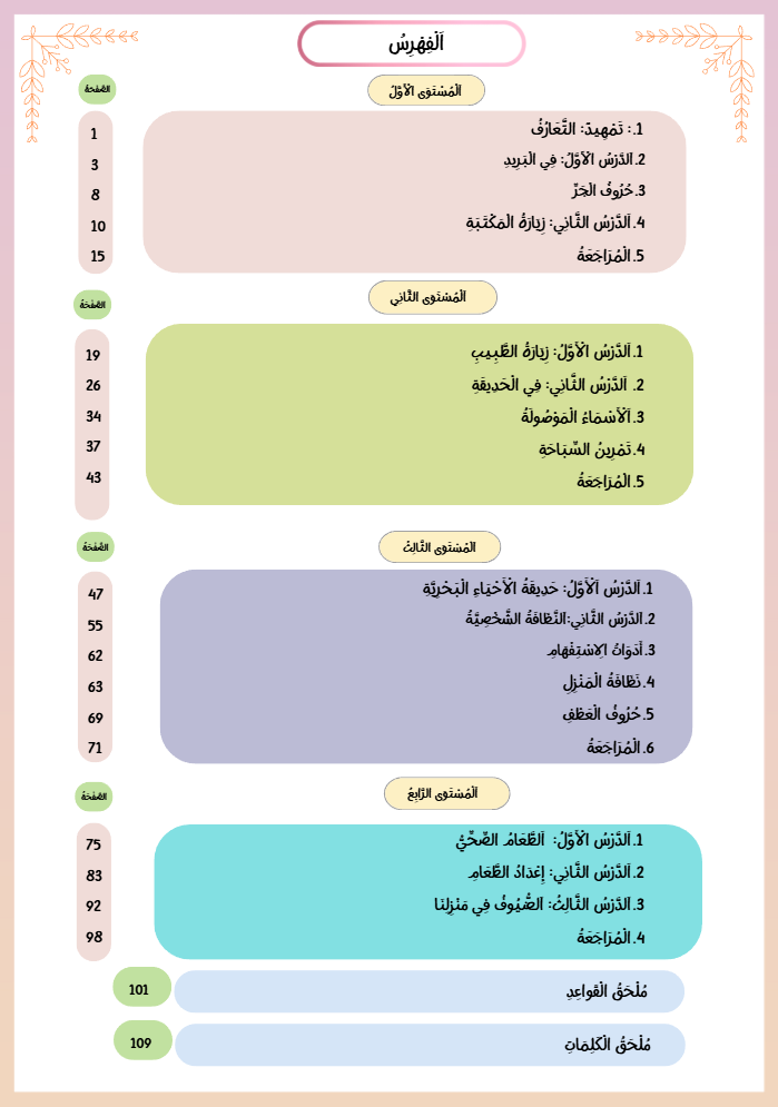 Book 6 of My Arabic Language Series covers essential topics for Arabic learners. It includes lessons on personal hygiene, household cleanliness, healthy eating, food preparation, and hosting guests, providing comprehensive grammar coverage. Additionally, it covers topics such as postal services, prepositions, visiting the library, activities in the garden, relative pronouns, and swimming practice. The book includes additional learning support at the end, with revision from previous books suitable for beginners. Throughout the book, there are review sections to help students master the content.